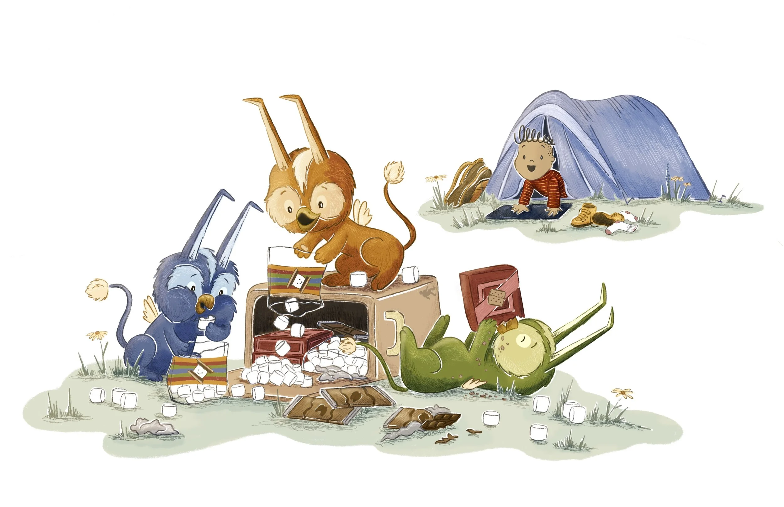 Cartoon scene of three imaginary animals—eating marshmallows at a campsite, with marshmallows and s'mores supplies scattered. In the background, a child in red striped pajamas climbs out of a tent next to a backpack and shoes. View fullsize